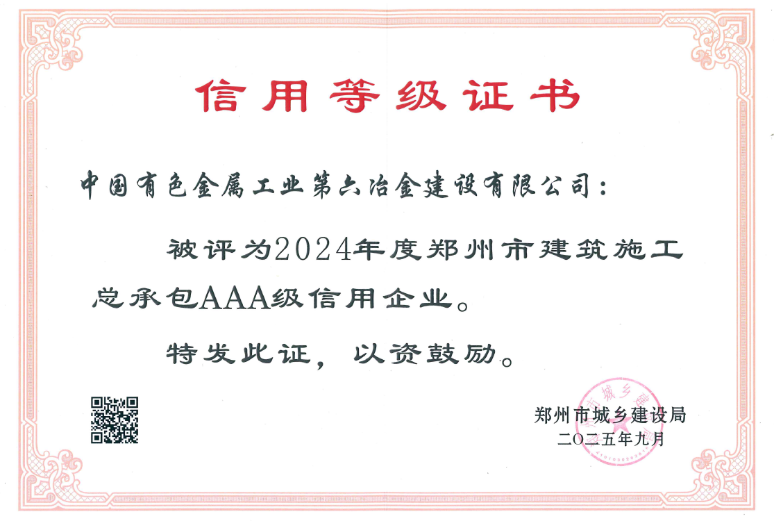 近日,郑州市城乡建设局公布2024年度建筑施工企业信用评价结果,六冶公司凭借卓越的综合实力和市场信誉,获“郑州市建筑施工总承包AAA级信用企业”称号。